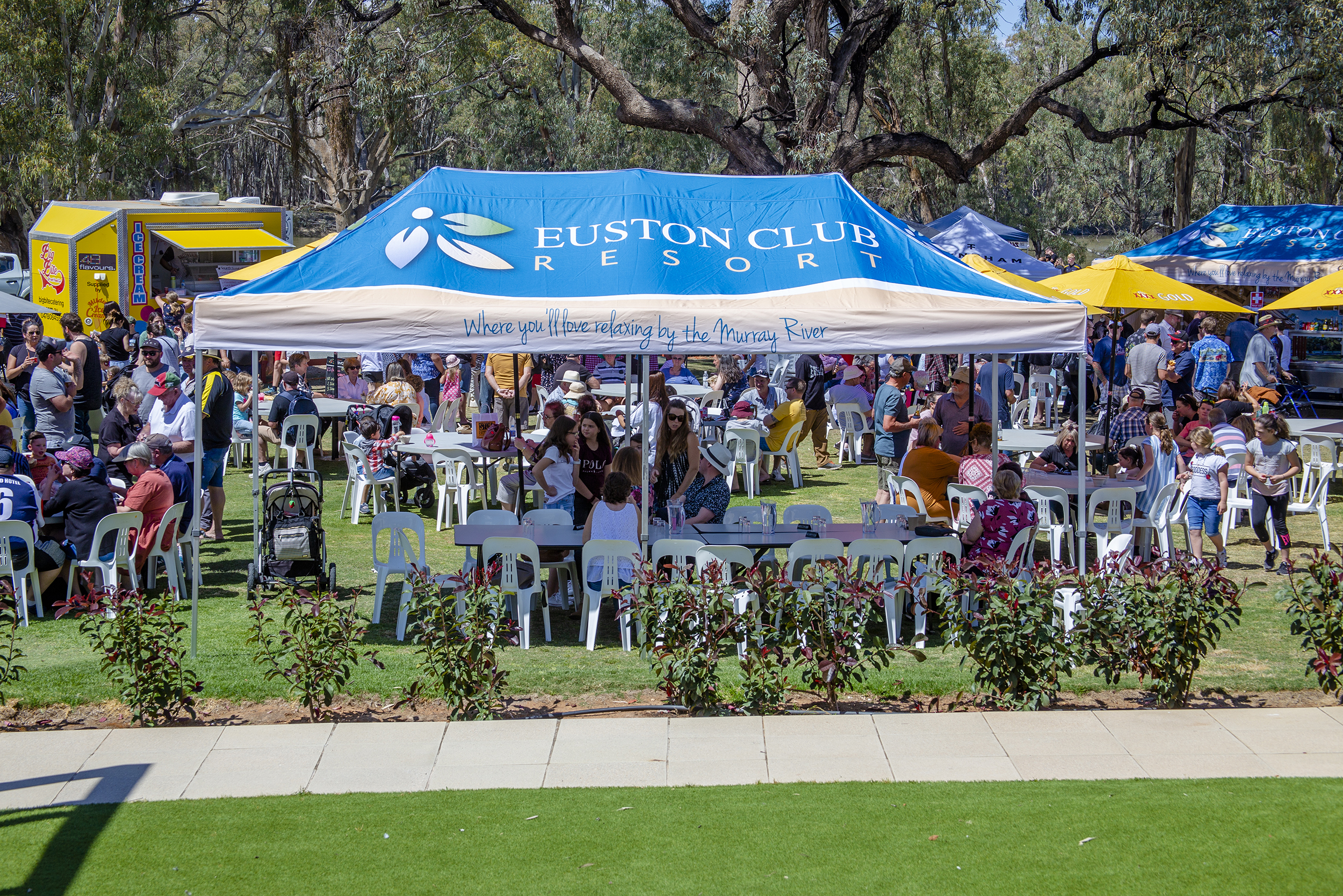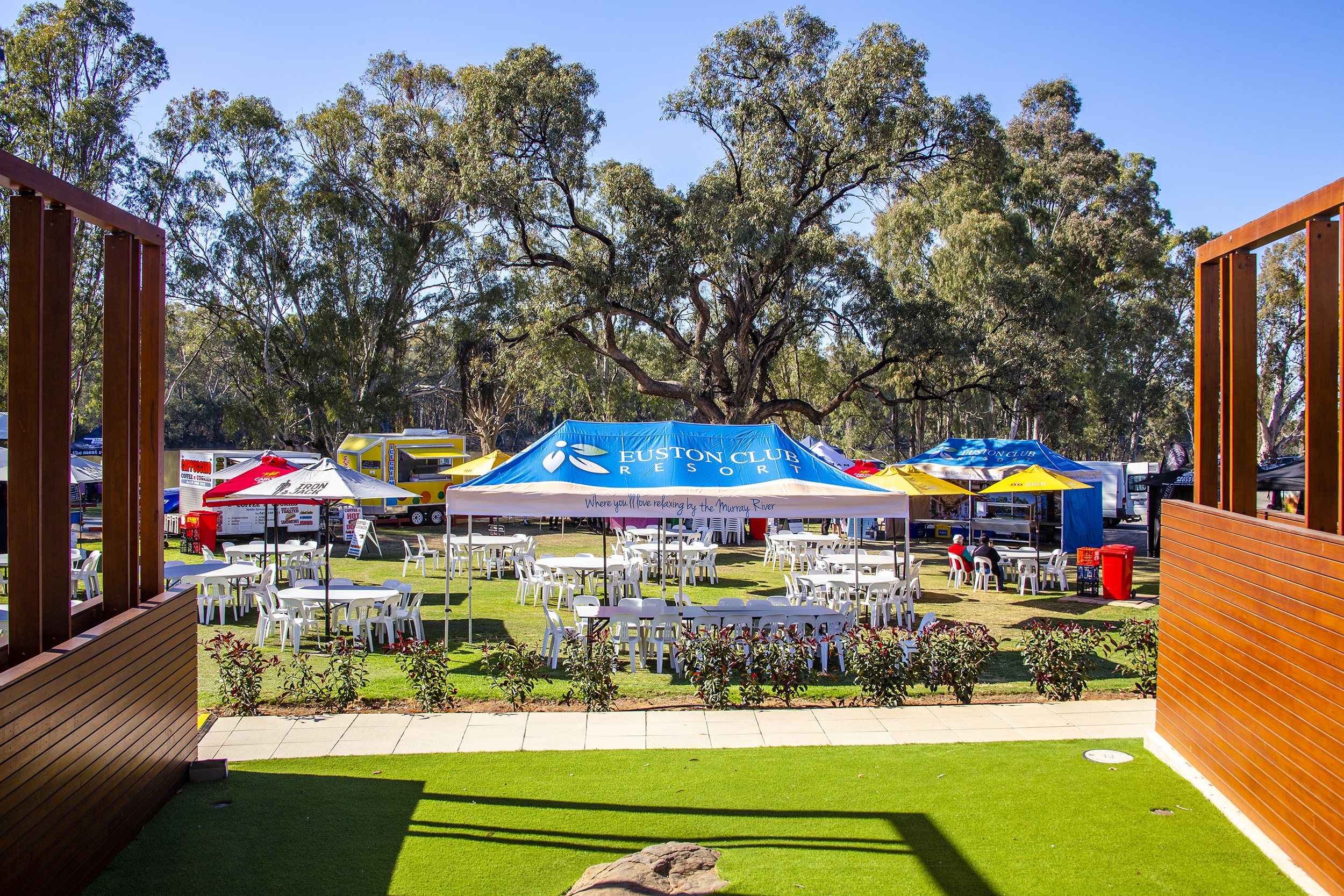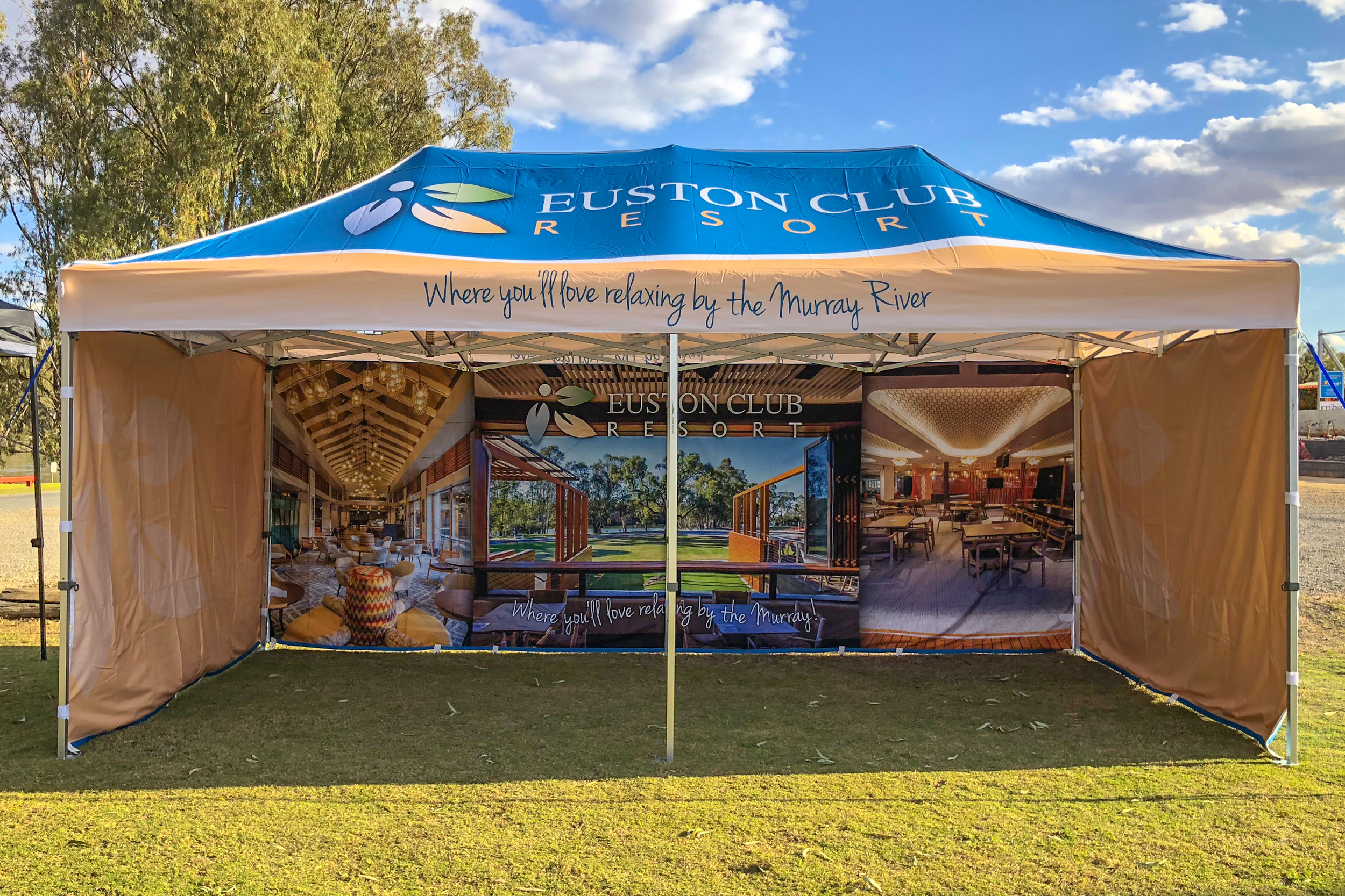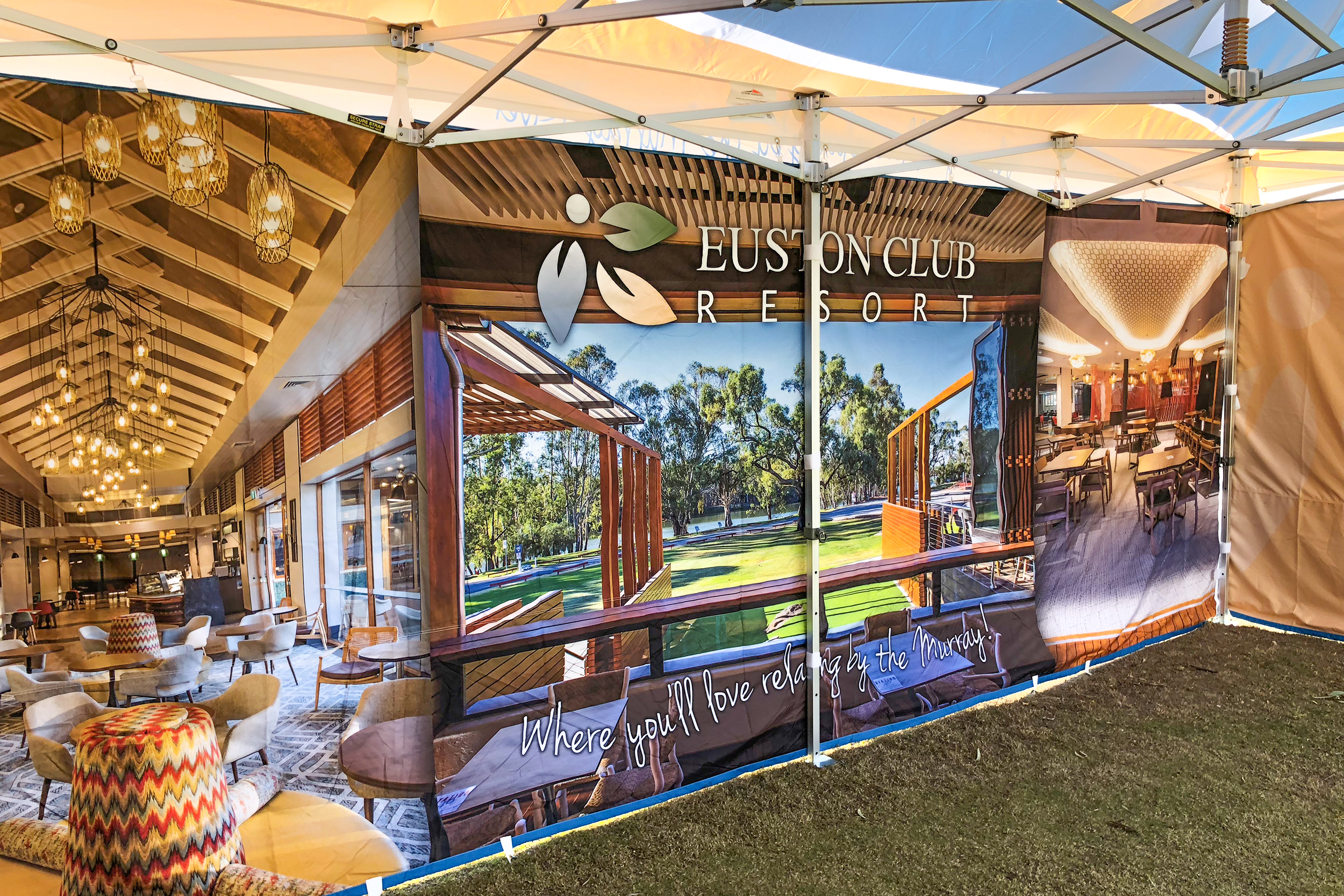 The design purposefully brings the club experience out into the community. By wrapping the marquee with lifestyle-driven photography – dining spaces, open lounges and the sweeping Murray River views – it transports people onsite into the club environment before they ever step through the doors. The interior becomes a virtual walkthrough: inside to outside, lounge to riverfront. For events and festivals, this creates a powerful first impression, turning the marquee into a branded destination that captures attention, reinforces the resort’s identity and invites people to experience the club for real.